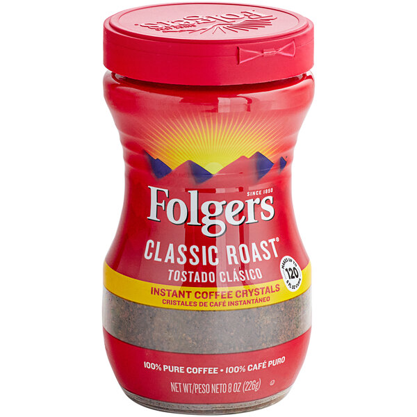 Folgers Classic Roast Instant Coffee 8 oz. Folgers Classic Roast Instant Coffee Crystals 8-Ounce Jar Just add hot water or milk and enjoy hot or cold. Is discontinued by manufacturer : Contains 18 ounce easyopen fliptop jar. The classic folgers taste you love in instant coffee form ; Just one rounded teaspoon yields a cup full of classic folgers flavor. Just add water, stir and enjoy for a quick instant coffee. Roasted in new. Folgers Classic Roast Instant Coffee Crystals 8-Ounce Jar.